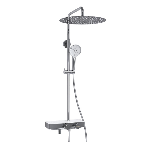 Характеристики: Напор воды не регулируется. Рекомендуем установку понижающих давление редукторов. Входит в комплект: - Душевая насадка ? 400 мм, 248 форсунок, нержавеющая сталь; - Стойка для душа, ? 24 мм регулируемая по высоте; - Лейка 3-функциональная с системой защиты от известковых отложений; - Шланг ПВХ 1500 мм, подключение к лейке; - Термостатический смеситель; - Термостатический картридж Vernet (Франция); - Встроенный пластиковый аэратор Neoperl HONEYCOMB (Германия) с регулируемым углом накло- на струи; - Обратный клапан Neoperl (Германия); - Керамический поворотный переключатель; - Набор для монтажа.