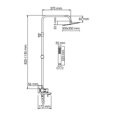 Входит в комплект: - Душевая насадка 300 x 300 мм, 196 форсунок, нержавеющая сталь; - Стойка для душа, ? 22 мм регулируемая по высоте; - Лейка 1-функциональная с системой защиты от известковых отложений; - Шланг ПВХ 1500 мм, подключение к лейке; - Смеситель для ванны с коротким изливом; - Керамический картридж 35мм, Sedal (Испания); - Встроенный пластиковый аэратор Neoperl HONEYCOMB (Германия) с регулируемым углом наклона струи; - Керамический поворотный переключатель; - Набор для монтажа. Материал: латунь, ABS-пластик, нержавеющая сталь. Хромоникелевое покрытие.