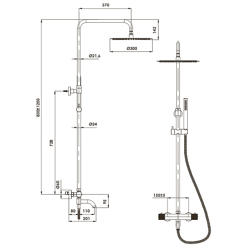 Оснащение Душевая насадка ? 300 мм, 168 форсунок, нержавеющая сталь,Стойка для душа, ? 24 мм,регулируемая по высоте,Лейка 1-функциональная с системой защиты от известковых отложений,Шланг металлический 1500 мм, подключение к лейке,Термостатический смеситель,Термостатический картридж Vernet (Франция),Встроенный пластиковый аэратор Neoperl HONEYCOMB (Германия) с регулируемым углом наклона струи,Обратный клапан Neoperl (Германия),Керамический поворотный переключатель,Набор для монтажа