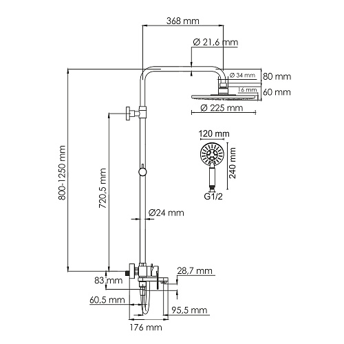 Входит в комплект: - Душевая насадка ? 225 мм, 200 форсунок, ABS-пластик; - Стойка для душа, ? 24 мм регулируемая по высоте; - Лейка 3-функциональная с системой защиты от известковых отложений; - Шланг ПВХ 1500 мм, подключение к лейке; - Смеситель для ванны с коротким изливом; - Керамический картридж 35мм, Sedal (Испания) - Встроенный пластиковый аэратор Neoperl HONEYCOMB (Германия); - Керамический поворотный переключатель; - Набор для монтажа.