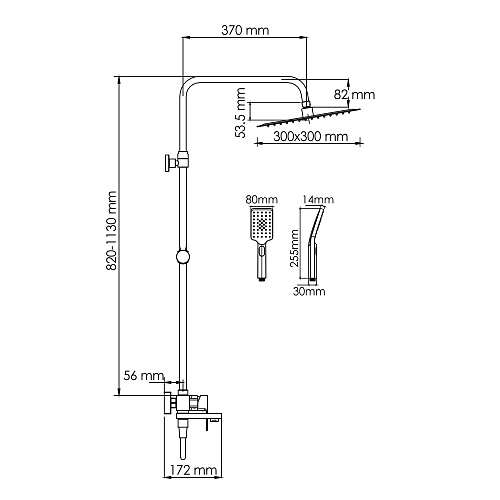 Входит в комплект: - Душевая насадка 300 x 300 мм, 196 форсунок, нержавеющая сталь; - Стойка для душа, ? 22 мм регулируемая по высоте; - Лейка 3-функциональная с системой защиты от известковых отложений; - Шланг ПВХ 1500 мм, подключение к лейке; - Смеситель для ванны с коротким изливом; - Керамический картридж 35мм, Sedal (Испания); - Встроенный пластиковый аэратор Neoperl HONEYCOMB (Германия); - Керамический поворотный переключатель; - Набор для монтажа.