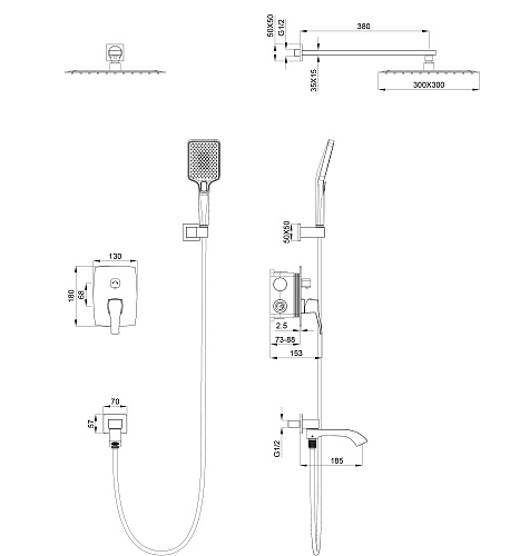 Оснащение Смеситель / Душевой шланг/ Держатель для душа / Верхний душ / Душевая лейка / Эксцентрики / Монтажный комплект