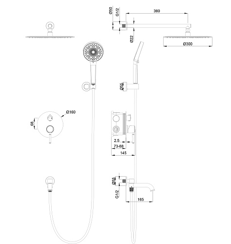 Оснащение Термостат / Смеситель / Душевой шланг/ Держатель для душа / Верхний душ / Душевая лейка / Эксцентрики / Монтажный комплект