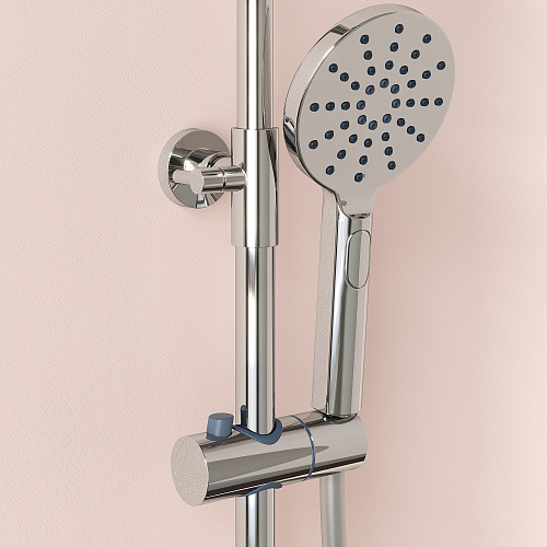 Смеситель с термостатом из высококачественной латуни Встроенный дивертер для переключения между верхним и ручным душем Возможность регулировки высоты и наклона ручного душа Верхний душ из металла с регулировкой наклона Безопасное управление температурой благодаря кнопке на ручке Цвет хром глянцевый Возможность регулировки высоты штанги Ручной душ - 4 режима с кнопкой переключения