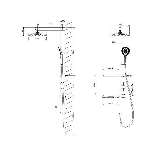 Оснащение Верхний душ 30 см, ручной душ, смеситель со встраиваемой частью, девиатор.