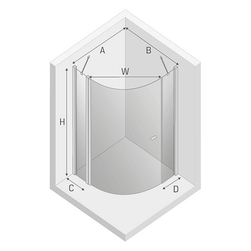 - безопасное закаленное стекло 6 мм; - защитное покрытие Active Shield. Технические размеры: Ширина (A): 98,5-100 см; Глубина (B): 98,5-100 см; Ширина входа (W): 71 см; Неподвижная секция (С): 46,5 см; Неподвижная секция (D): 45,5 см; Высота (H)