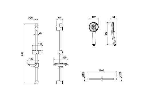 Оснащение 1. Душевая штанга 2. Держатель душевой лейки 3. Душевая лейка 4. Душевой шланг 5. Мыльница 6. Монтажный комплект