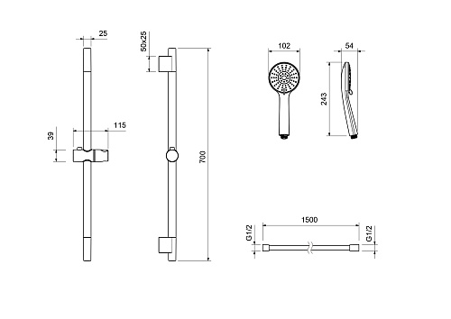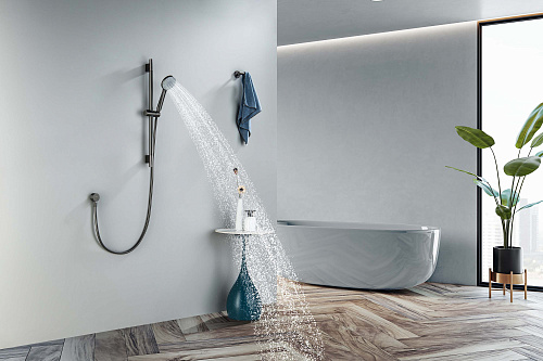 душевая штанга из нерж.; ручной душ из Пластика, 3 функции; душевой шланг из Пластика, длина 1,5м;