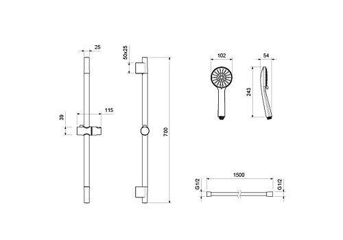 душевая штанга из нерж.; ручной душ из Пластика, 3 функции; душевой шланг из Пластика, длина 1,5м;