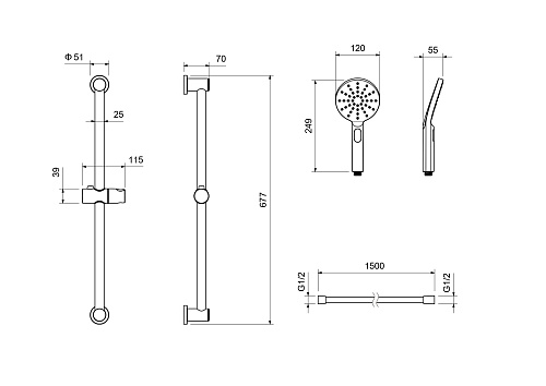 душевая штанга из нерж.; ручной душ из Пластика, 3 функции; душевой шланг из Пластика, длина 1,5м;