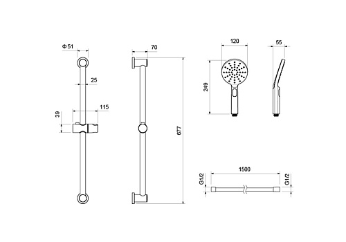 Оснащение 1. Душевая штанга 2. Держатель душевой лейки 3. Душевая лейка 4. Душевой шланг 5. Монтажный комплект