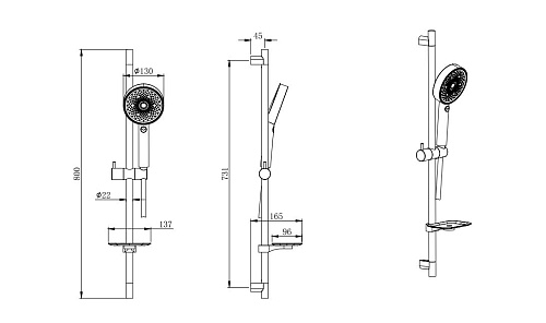 Оснащение 1. Душевая штанга 2. Держатель душевой лейки 3. Душевая лейка 4. Душевой шланг из ПВХ 5. Мыльница 6. Монтажный комплект