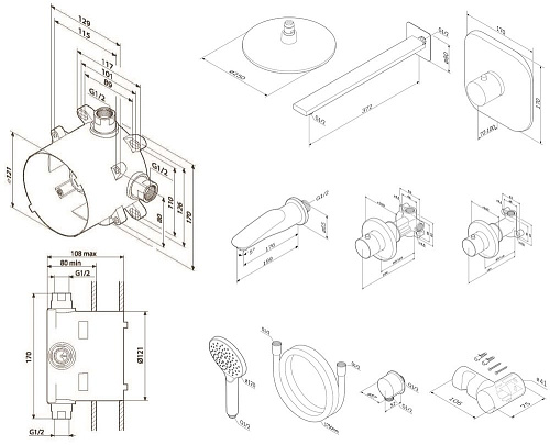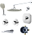 Оснащение Душевой гарнитур, верхний душ, излив, вентиль, смеситель для ванны с душем, внутренняя часть, настенный держатель, переключатель потоков, шланговое подключение.