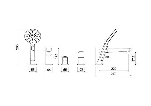 Оснащение 1. Смеситель 2. Излив смесителя 3. Дивертор 4. Ручная лейка 5. Шланг для лейки 150 см 6. Гибкая подводка