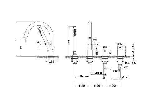 Оснащение 1. Смеситель 2. Излив смесителя 3. Дивертор 4. Ручная лейка 5. Шланг для лейки 150 см 6. Гибкая подводка