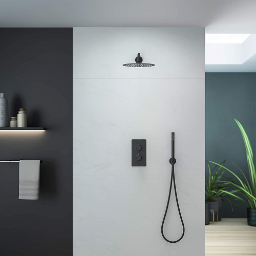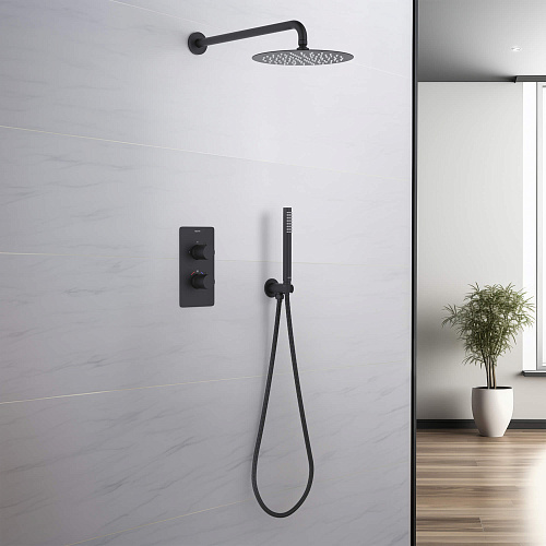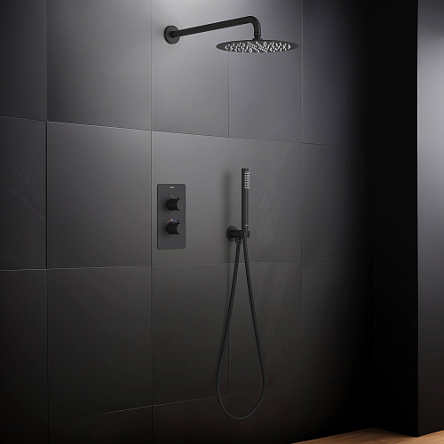 смеситель термостатический из латуни на 2 потребителя; картридж vernet, франция; декоративная пластина 3мм из нерж.; кронштейн для верхнего душа 400мм из нерж.; верхний душ 250х2мм из нерж.; душевой шланг 1,5м из нерж.; ручной душ из латуни на 1 режим струи; латунное шланговое соединение с держателем; упакован в коробку, пленку из вспененного пвх