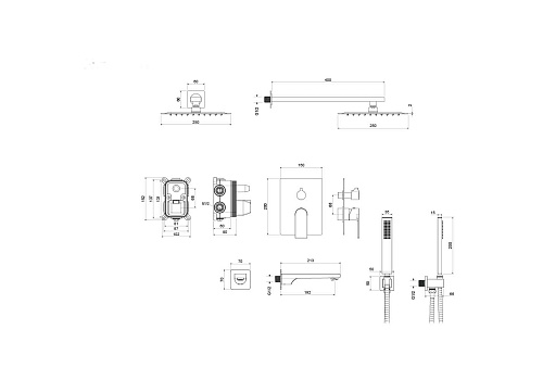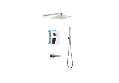 смеситель из латуни на 3 потребителя; картридж citec 35 мм, испания; декоративная пластина 3мм из нерж.; кронштейн для верхнего душа 400мм из нерж.; верхний душ 250х250х2мм из нерж.; ручной душ из латуни на 1 режим струи; душевой шланг 1,5м из нерж. с защитой от перекручивания; латунный держатель ручного душа; латунный излив с аэратором neoperl; упакован в коробку, пленку из вспененного пвх