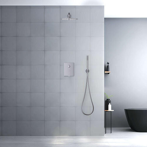 Оснащение 1. Смеситель из латуни с установочной коробкой на 2 потребителя (внешняя и скрытая часть) 2. Душевой гарнитур: лейка, шланг, шланговое подсоединение с держателем 3. Верхний душ 4. Декоративные накладки на стену из нержавеющей стали 3 мм