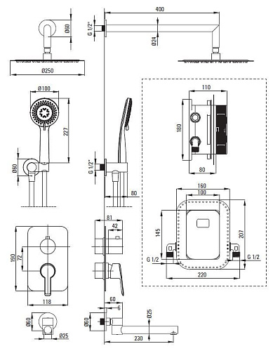 Вид смесителя: бокс скрытого монтажа, смешивающий. Акустическая группа [дБ]: I (x ? 20). Вид излива: складная. Форма верхнего душа: круглый. Толщина [мм]: 8. 2. Диаметр [мм]: 250. Anti-calc: да. Количество функций: 1. Виды струи: дождевой. Количество функций лейки: 3. Виды струи: дождевой, смешанный, гидромассаж. Вид оплетки шланга: не касается. Материал оплетки: PVC. Anti_twist: 1. Вид кронштейна: к шлангу с держателем лейки. Форма: круглый. Винт кронштейна: да. Скрытый монтаж: да. Дизайн, наполненный красотой и гармонией. Разнообразие цветов дает множество возможностей для оформления дизайна. Ультратонкая стальная головка. Система Anti-calc для легкого удаления известковых отложений. Система Anti-Twist, предотвращающая скручивание шланга. Только лучшие материалы, качество которых подтверждено лабораторными испытаниями. Скрытый монтаж обеспечивает эстетику ванной комнаты. Складной излив повышает комфорт и безопасность. Прочные наконечники шлангов из латуни. Регулируемый угол наклона душевой лейки. 3-х функциональный ручной душ. Уникальность и неограниченные творческие возможности. Целостность и многогранность предложения. Лучшие материалы, гарантирующие долговечность и надежность изделия. Инновационное и простое в уходе покрытие - брашированное золото. Специальное средство, безопасное для очищаемых поверхностей.