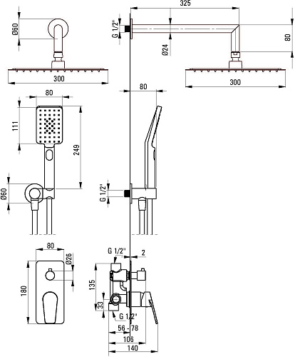 Вид смесителя: однорычажный, смешивающий. Акустическая группа [дБ]: I (x ? 20). Вид излива: стандартный. Форма верхнего душа: прямоугольный. Ширина [мм]: 300. Длина [мм]: 300. Толщина [мм]: 55. Anti-calc: да. Количество функций: 1. Виды струи: дождевой. Быстрое время отклика на включение и выключение воды: да. Количество функций лейки: 3. Виды струи: дождевой, водяной туман, смешанный. Вид оплетки шланга: не касается. Материал оплетки: PVC. Anti_twist: 2. Вид кронштейна: к шлангу с держателем лейки. Форма: круглый. Винт кронштейна: да. Скрытый монтаж: да. Доступны специальные препараты для облегчения ухода за продуктами. Только лучшие материалы, качество которых подтверждено лабораторными испытаниями. Специальное средство, безопасное для очищаемых поверхностей.