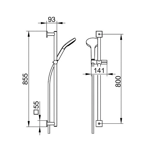 Оснащение Настенная штанга 855 мм (розетки квадратные) с передвижным держателем душевой лейки, компенсатор для плитки (5 мм), ручная душевая лейка с нормальной, мягкой и массажной струей, душевой шланг.