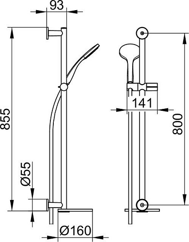 Оснащение Настенная штанга 855 мм (розетки круглые) с передвижным держателем душевой лейки, поворотная полка (? 160 мм), компенсатор для плитки (5 мм), ручная душевая лейка с нормальной струей, душевой шланг.