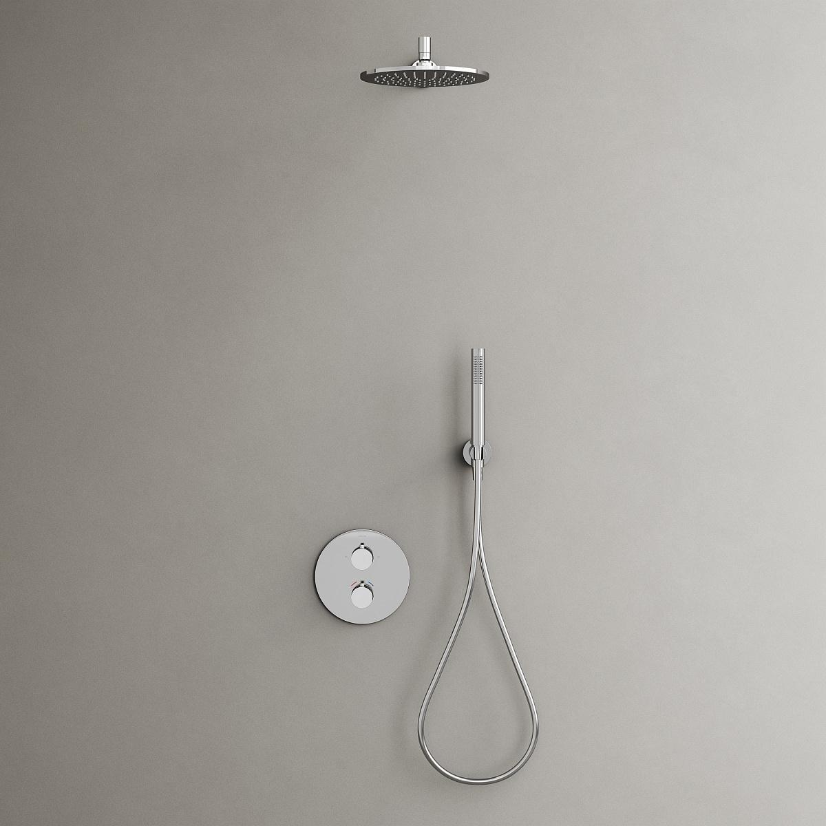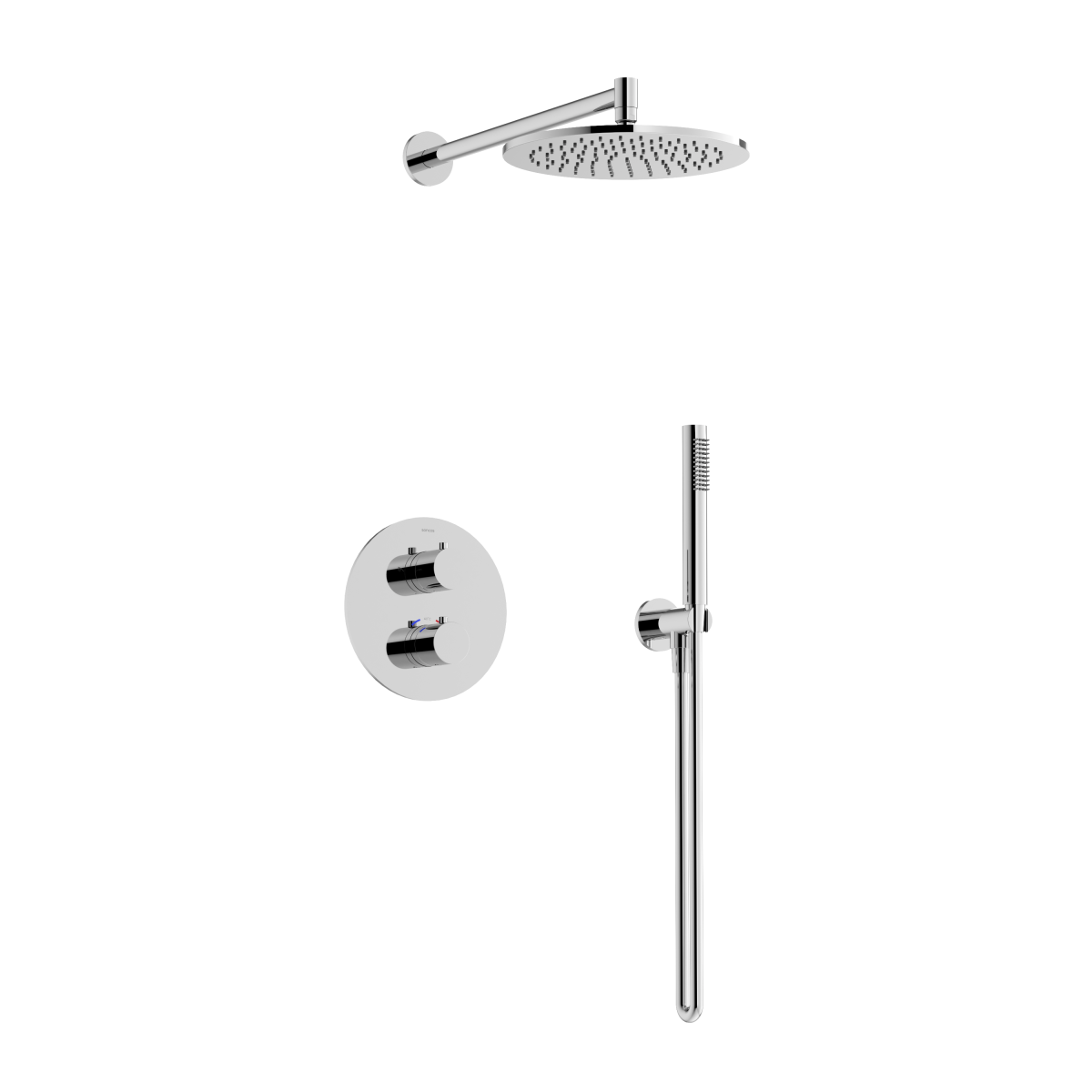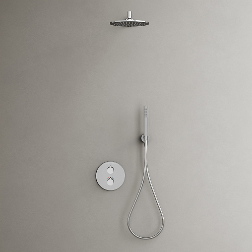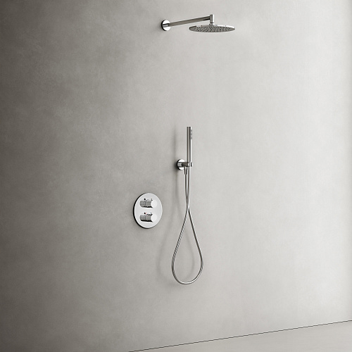 Всмеситель скрытого монтажа со встроенным термостатом; Надежный корпус из высококачественной латуни; Термостатический картридж SEDAL - обеспечивает точную настройку заданной температуры; Встроенный девиатор автоматически переклюключает поток с верхнего душа на ручной при выключении воды. Ручной душ из латуни; Шланг ПВХ с системой защиты от перекручивания, длина 1,5 м; Верхний душ из нержавеюшей стали , Ø250 мм, с возможностью регулировки угла наклона; прочное покртытие методом электроплейтинга; цвет хром