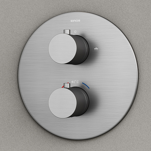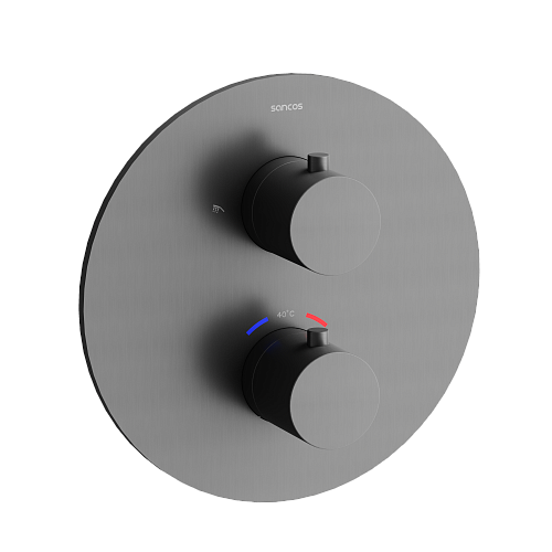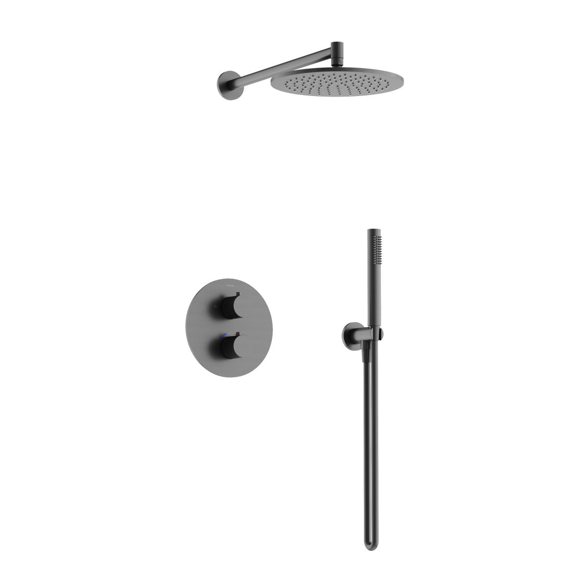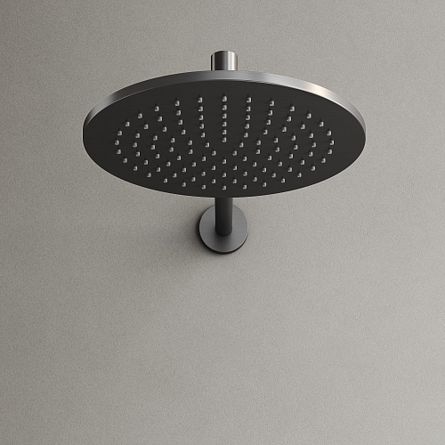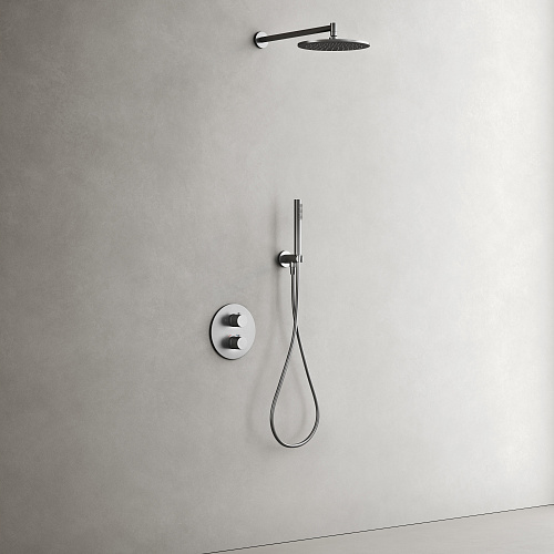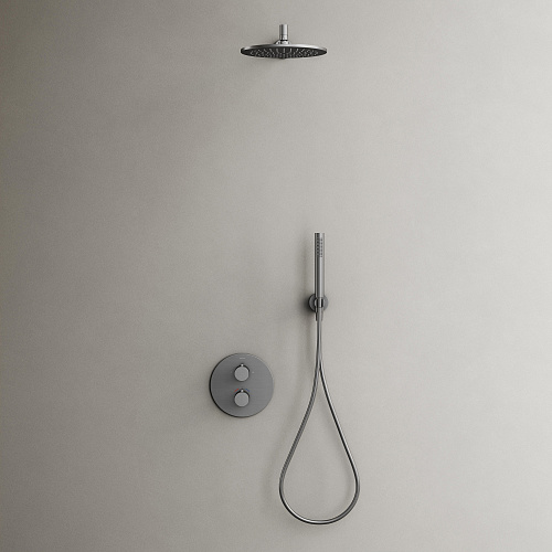 Смеситель со встроенным термостатом; Надежный корпус из высококачественной латуни; Термостатический картридж SEDAL (Испания) - обеспечивает точную настройку заданной температуры; Встроенный девиатор SEDAL (ИСпания) автоматически переклюключает поток с верхнего душа на ручной при выключении воды. Ручной душ из латуни; Шланг ПВХ с системой защиты от перекручивания, длина 1,5 м; Верхний душ из нержавеюшей стали , Ø250 мм, с возможностью регулировки угла наклона; прочное покртытие методом электроплейтинга; цвет матовый черный ; экстрапрочное PVD покрытие; Цвет вороненая сталь