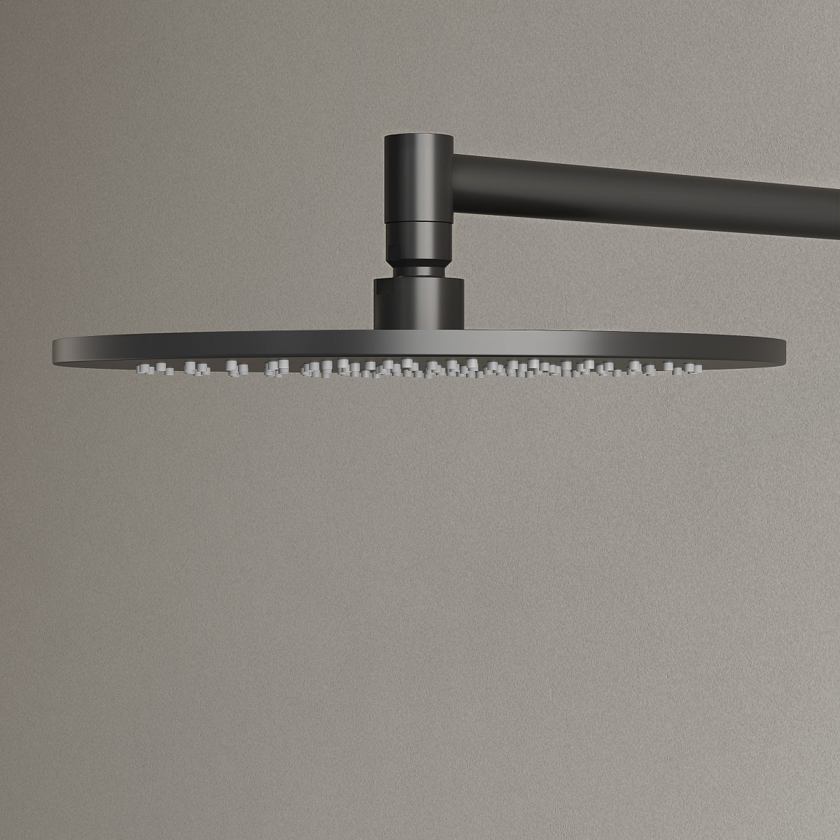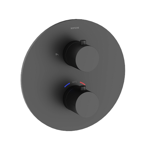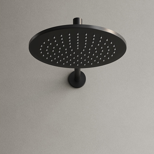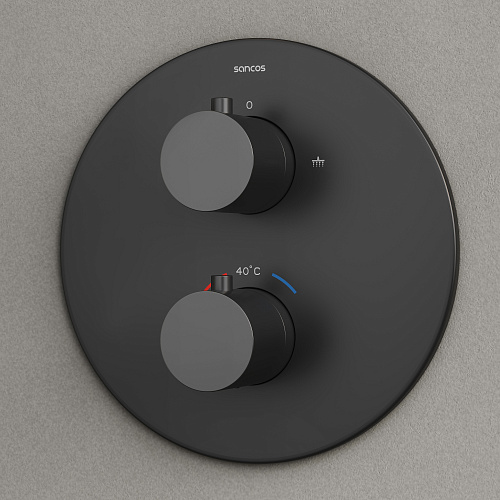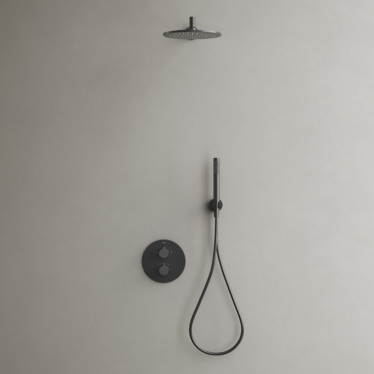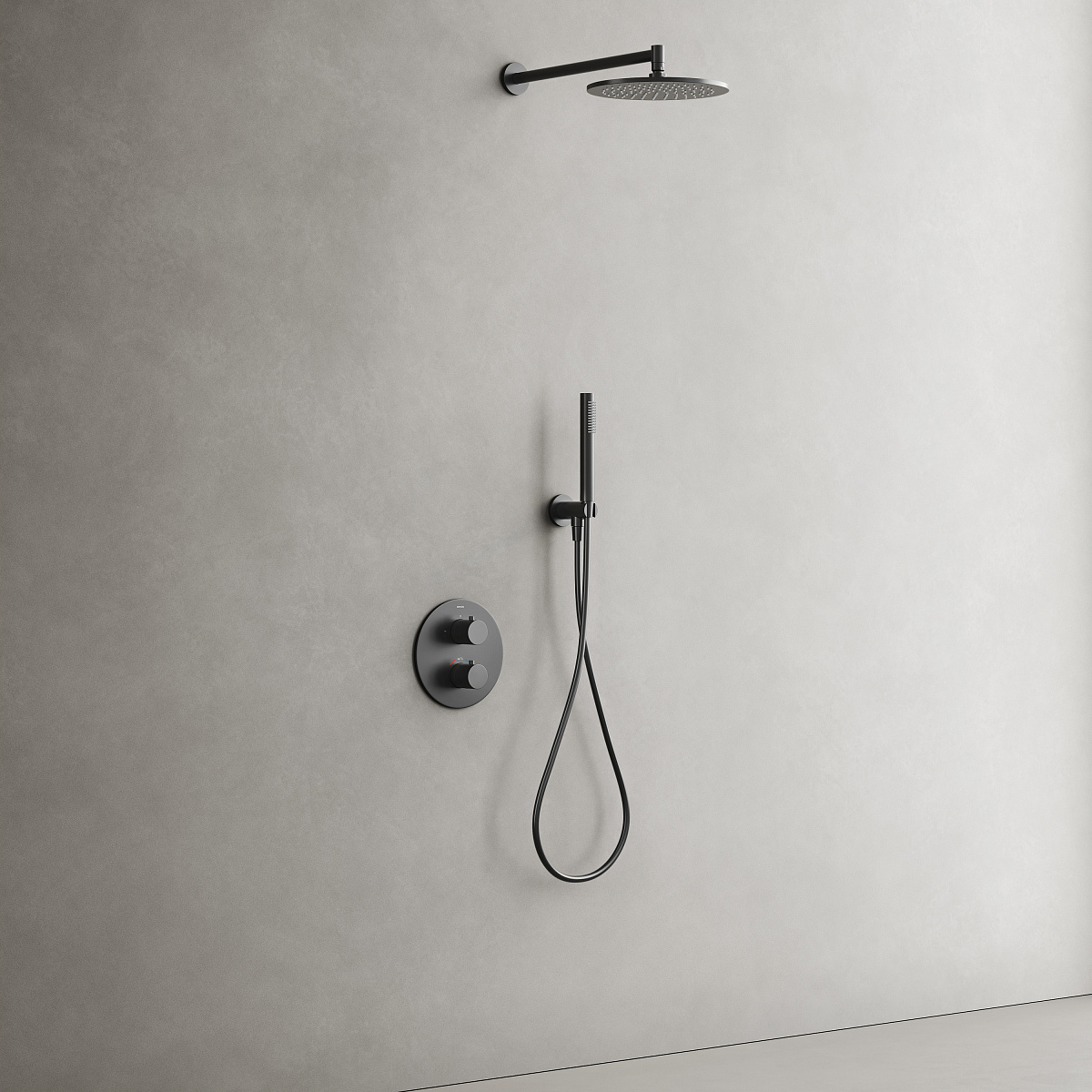 Смеситель со встроенным термостатом; Надежный корпус из высококачественной латуни; Термостатический картридж SEDAL (Испания) - обеспечивает точную настройку заданной температуры; Встроенный девиатор SEDAL (ИСпания) автоматически переклюключает поток с верхнего душа на ручной при выключении воды. Ручной душ из латуни; Шланг ПВХ с системой защиты от перекручивания, длина 1,5 м; Верхний душ из нержавеюшей стали , Ø250 мм, с возможностью регулировки угла наклона; прочное покртытие методом электроплейтинга; цвет матовый черный