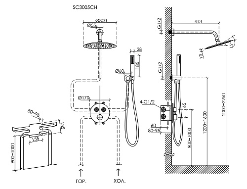 Душевой комплект Sancos SC3005CH Link встраиваемый, c термостатическим смесителем, хром