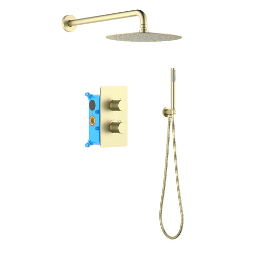 смеситель термостатический из латуни на 2 потребителя; картридж vernet, франция; декоративная пластина 3мм из нерж.; кронштейн для верхнего душа 400мм из нерж.; верхний душ 250х2мм из нерж.; душевой шланг 1,5м из нерж.; ручной душ из латуни на 1 режим струи; латунное шланговое соединение с держателем; упакован в коробку, пленку из вспененного пвх