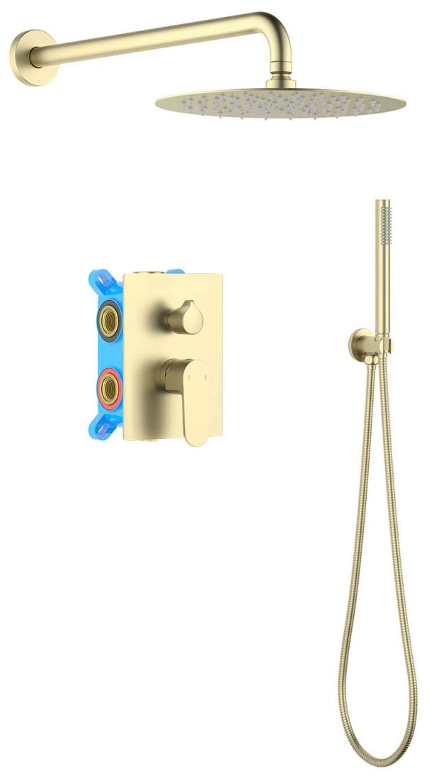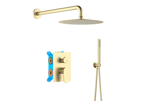 смеситель из латуни на 2 потребителя с установочной коробкой; картридж citec 35 мм, испания; декоративная пластина 3мм из нерж.; дивертор - керамический картридж; кронштейн для верхнего душа 400мм из нерж.; верхний душ 250х2мм из нерж.; латунный держатель ручного душа; ручной душ из латуни на 1 режим струи; душевой шланг 1,5м из нерж.; упакован в коробку, пленку из вспененного пвх