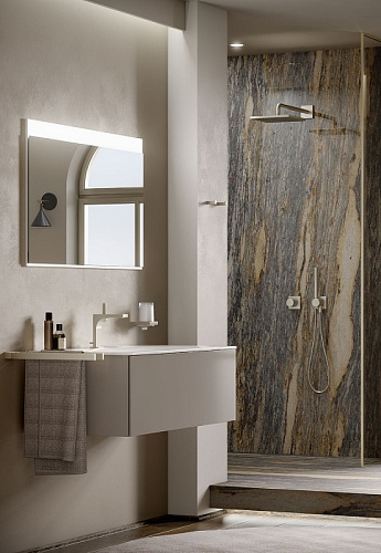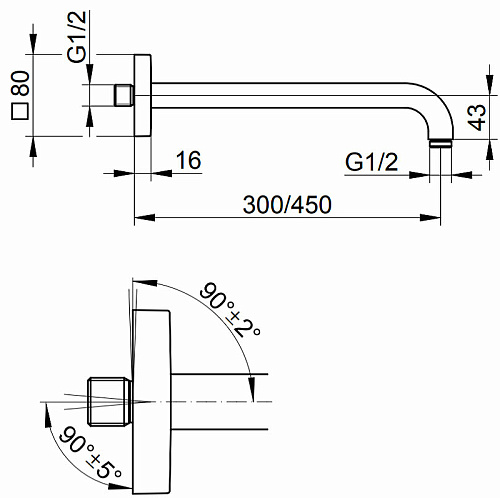 Из стены G1/2, возможность выравнивания к стене (90° ± 2°) и к подключению в стене (90° ± 5°).