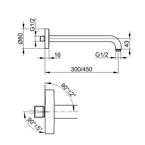 Из стены G1/2, возможность выравнивания к стене (90° ± 2°) и к подключению в стене (90° ± 5°).