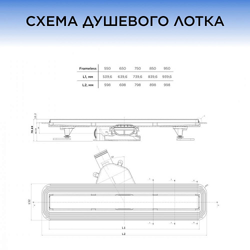 Оснащение 1. Душевой трап – 1 шт. 2. S-образный сифон 3. Опоры для регулировки высоты 4. Переходник с уплотнительной резинкой 5. Грязеулавливающая сеточка 6. Сухой затвор 7. Дизайн вставка 8. Устройство для снятия решетки – 1 шт. 9. Набор крепежей – 1 компл. 10. Гидроизоляционная лента – 1 компл. 11. Инструкция по монтажу – 1 шт. 12. Гарантийный талон – 1 шт. 13. Упаковка – 1 шт.