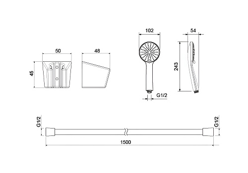 Оснащение 1. Держатель для душа 2. Душевой шланг из ПВХ 150 см 3. Душевая лейка