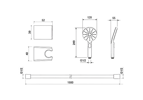 ручной душ из Пластика, 3 функции; Пластиковый держатель для душа; Пластиковый душевой шланг, длина 1,5м