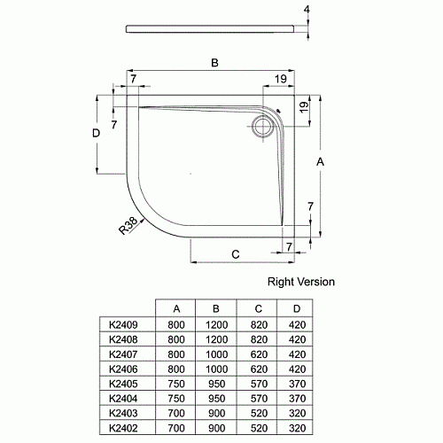 ULTRAFLAT Акриловый асимметричный душевой поддон, правая версия. Сифон, ножки и крепеж к стене заказываются дополнительно. Подходит для напольной и утопленной установки.