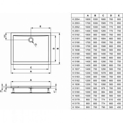ULTRAFLAT Акриловый прямоугольный душевой поддон. Сифон, ножки и крепеж к стене заказываются дополнительно. Подходит для напольной и утопленной установки.