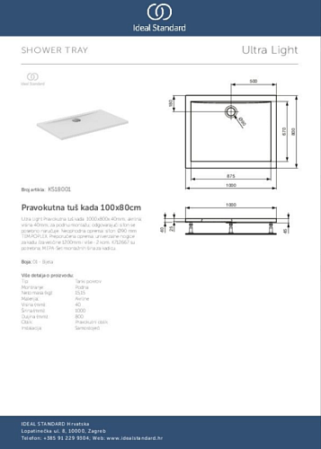 Душевой поддон Ideal Standard K518101 Ultralight 100х90 см, Euro White (евробелый)