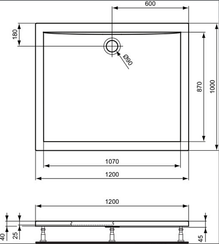ULTRAFLAT Акриловый прямоугольный душевой поддон. Сифон, ножки и крепеж к стене заказываются дополнительно. Подходит для напольной и утопленной установки.