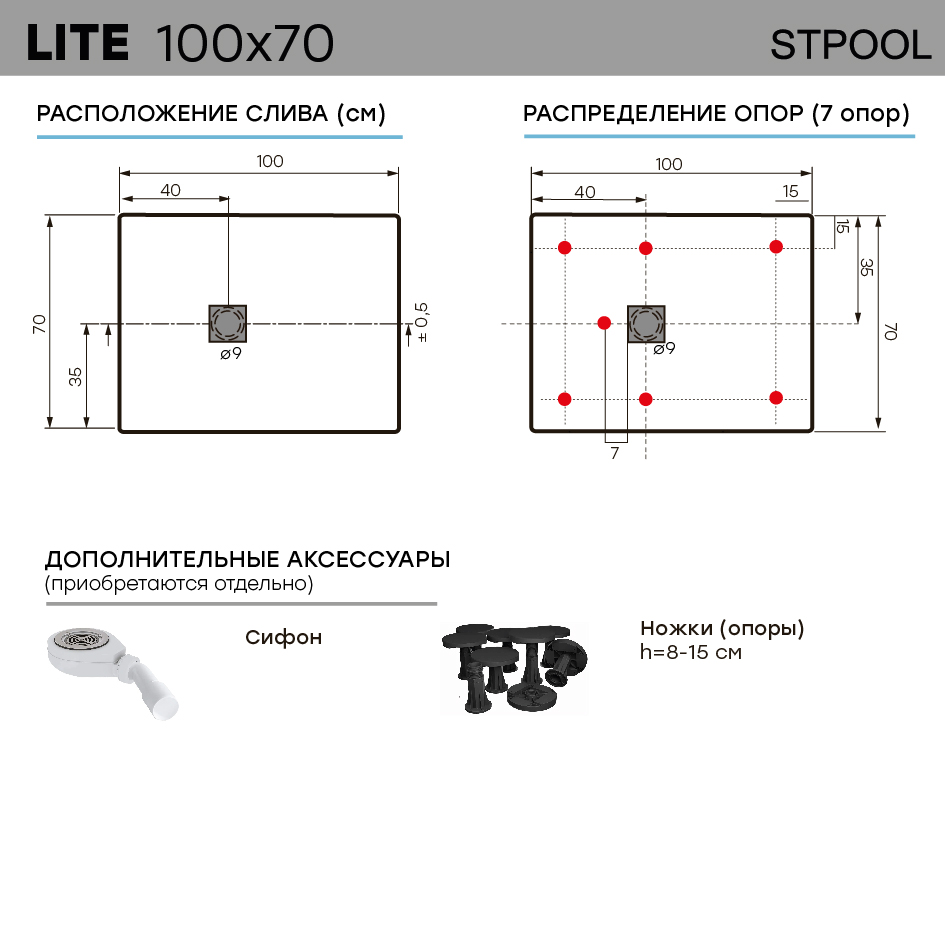 Душевой поддон Lite изготовлен из композитного материала и представляет собой смесь полиэфирной смолы, стекловолокна, наполнителя и верхнего гелевого слоя SUNILUX. Покрытие SUNILUX противоскользящее, термостойкое, стойкое к окрашиванию и УФ-излучению. Душевые поддоны производятся на современном европейском оборудовании для европейского рынка. Контроль качества осуществляется на всех этапах производства. Продукция производится и тестируется в соответствии с европейскими стандартами CE и EN: EN14516, EN 14527, IAPMO Z124-2017. Нескользящая поверхность Antislip R12 Поверхность с имитацией сланца Прочный Стойкий к перепадам температур Стойкий к воздействию химических веществ Устойчивый к загрязнениям Не меняет цвет от времени Экологически нейтральный материал Теплый на ощупь, приятный тактильный эффект Хорошее шумопоглощение (в отличие от стали и акрила) Легко моется с использованием бытовых моющих средств Возможность подрезки под индивидуальный размер Гарантия 3 года *