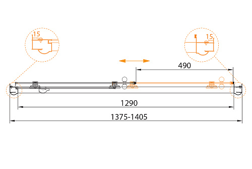Дверь в проём. Тип дверей: одна раздвижная. Стекло: 6 мм; C (прозрачное), СP (прозрачное c матовымузором) или PP (матовое с прозрачным узором); Исполнение: Cr (хром), Br (бронза) или G (золото). Поддон: возможность комплектации поддонами типа A, AH (поддоны приобретаются отдельно). Особенности: * гарантийная безотказная работа в течение 15 лет или 29500 циклов открывания.