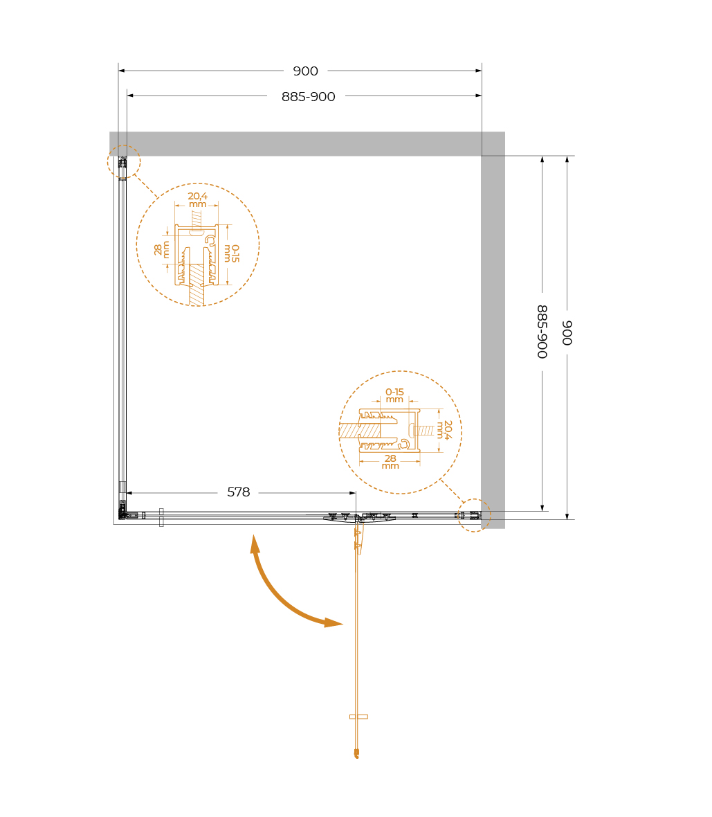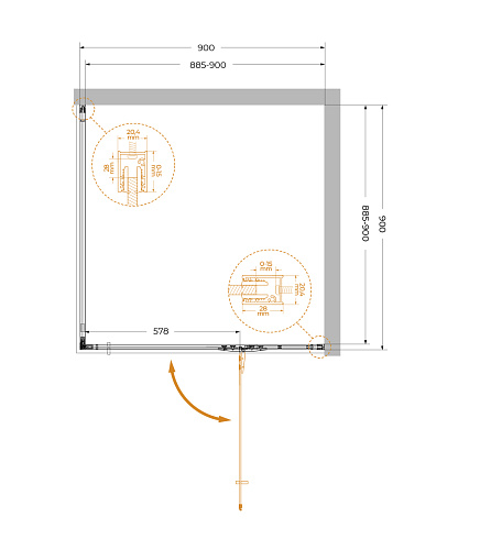 2. Двухточечное крепление петель к стеклу • Гарантия отсутствия провисания дверей и нарушения герметичности душевого ограждения.