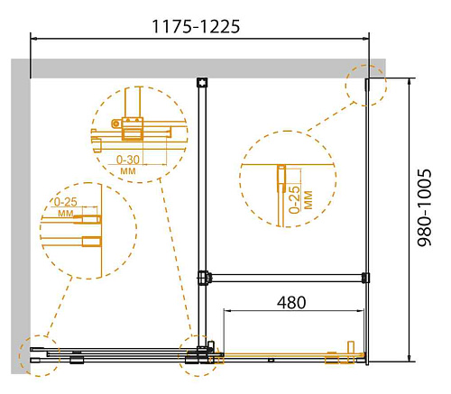 Душевой уголок. Тип дверей: одна раздвижная дверь. Стекло: 8 мм, прозрачное. Исполнение: хром. Поддон: тип АН, А или барьер. Поддон или барьер приобретается отдельно. Особенности: безпрофильное ограждение, нижние ролики, позаботятся о плавной и бесшумной фиксации двери..