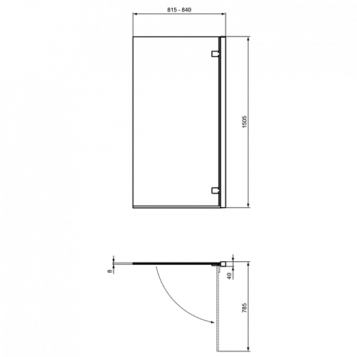 I.LIFE Экран для прямоугольной ванны, правая версия, безопасное прозрачное стекло 8 мм, антиизвестковое покрытие Ideal Clean, алюминиевый профиль Bright silver, регулировка профиля до 25 мм, скрытые винты. Без полотенцедержателя. Открытие наружу. Шарнир для крепления к стене. Не реверсивная версия.
