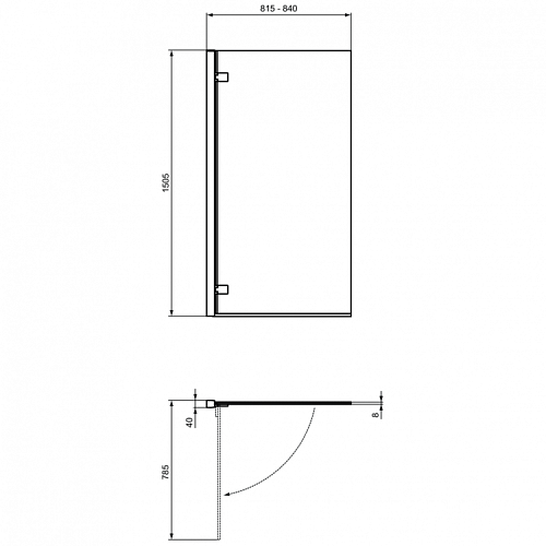I.LIFE Экран для прямоугольной ванны, левая версия, безопасное прозрачное стекло 8 мм, антиизвестковое покрытие Ideal Clean, алюминиевый профиль Bright silver, регулировка профиля до 25 мм, скрытые винты. Без полотенцедержателя. Открытие наружу. Шарнир для крепления к стене. Не реверсивная версия.