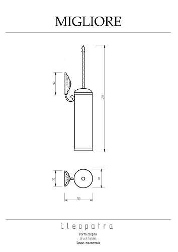 Настенный ершик коллекции Cleopatra бренда Migliore – это функциональный аксессуар для ванной комнаты. Внутри латунной колбы вставлена пластиковая колба, которую легко вынуть, чтобы помыть. Розетка аксессуара имеет необычную форму, и удобный крепеж. Изделие выполнено из латуни и имеет высококачественное хромо-никелевое покрытие, которое при правильном уходе надолго сохранит свой блеск. Рекомендуется использовать чистящее средство бренда Migliore для смесителей и аксессуаров с хромированным покрытием.