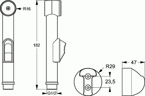 Гигиенический душ, комплект, состоящий из: лейки с кнопкой вкл/выкл. (2,5 см), пластик, без ограничителя потока, шланга 1250 мм M1/2“xM1/2“ IDEALFLEX, фиксированного держателя для душевой лейки, хром. Упаковано в картонную коробку. Инструкция по монтажу в комплекте.