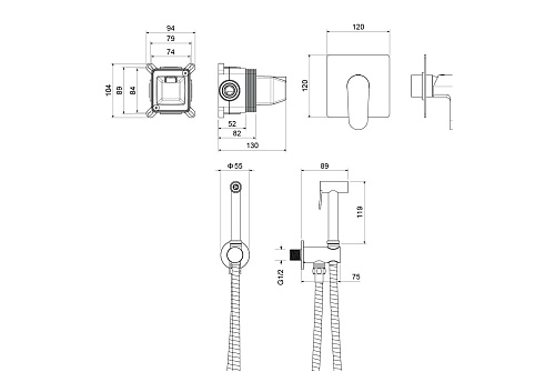 смеситель из латуни с установочной коробкой; картридж citec 35 мм, испания; декоративная пластина 3мм из нерж.; латунный гигиенический душ; латунный держатель для душа; душевой шланг 1,2м из нерж.